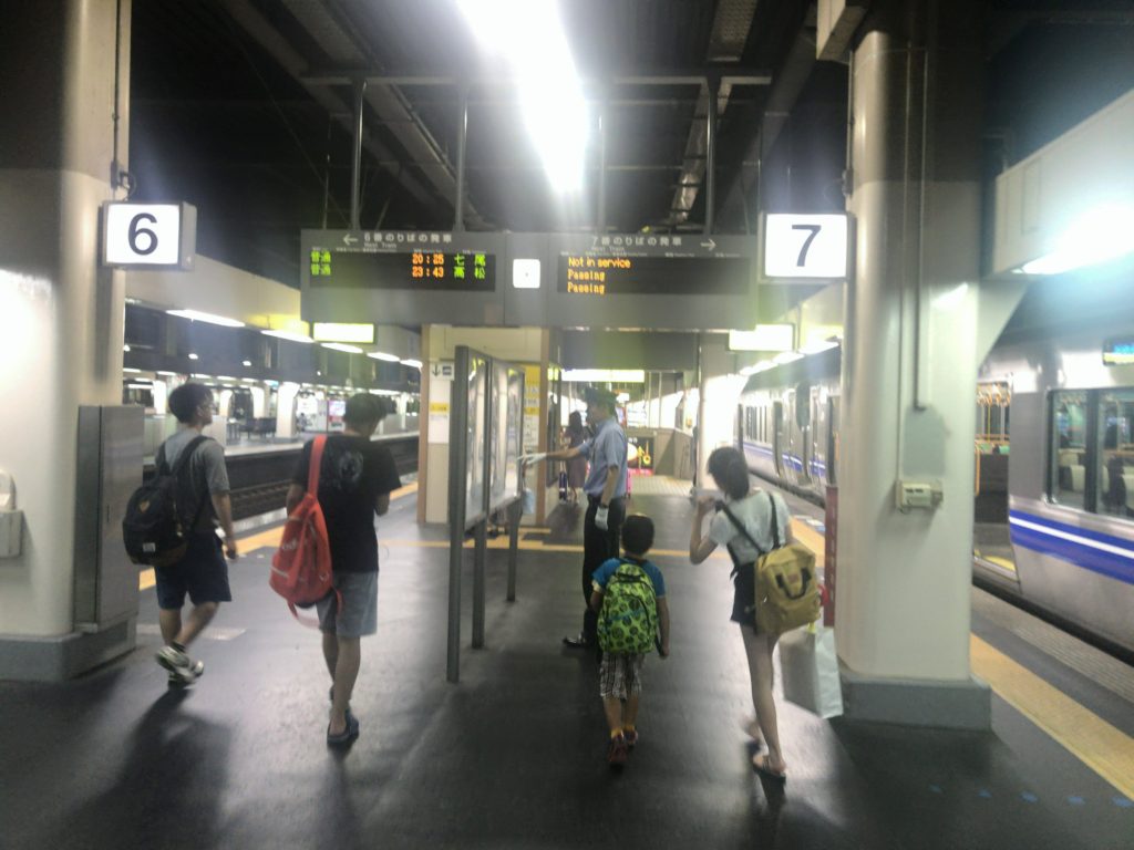 そこから京都方面に向かおうとするも、強風の影響で電車が30分以上遅れていて、前に並んでいた足の細い読モみたいな女の子も「こんなに遅れてるって思ってなくてさ~」と電話で話していた。自分はというと、ほぼ屋外みたいなホームで汗をだらだらかいて若干気分悪くなってましたまいどおおきに。