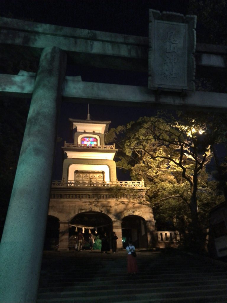 ふと月が出ている方を見ると不思議な神社があった。門がステンドグラスの神社なんて初めて見た。寄らないわけには行かなかった。