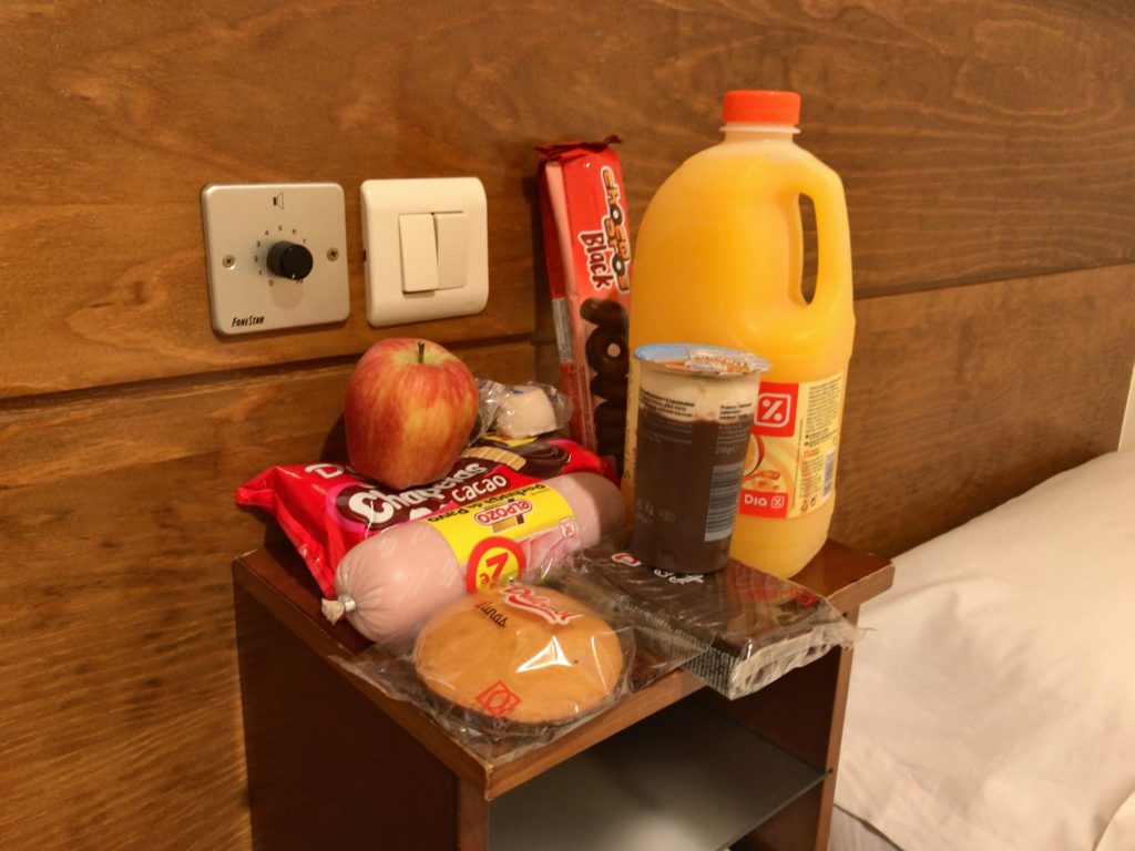 他に買ったものたち。明日の朝の分も必要だし~と調子に乗って、わけのわからないものばかりを大量に買い過ぎてしまった。リンゴとお菓子は保存食になるけど。(キッチンがないと難しいのです!という言い訳)