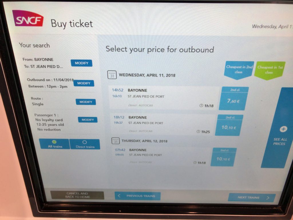 こちらの複数画面にも7時52分発のバイヨンヌ行きはなかったので、窓口の職員にiPhoneにダウンロードしてあるチケットを見せながら聞いた。どうやらこの階ではなく上らしい。