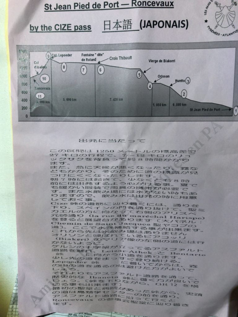 パスポートを見せて名前を用紙に書き込んで、クレデンシャルという巡礼手帳を2ユーロで購入し、最初のスタンプを押してもらってから、明日のルートの説明を受けたんだけど、英語で説明してくれたのはいいが、悩みに悩んだ。というのも、ナポレオンルートというピレネー山脈を越えるルートと、国道沿いの谷を歩くルートがあって、その前者のナポレオンルートは危険だと何度も言われたから。